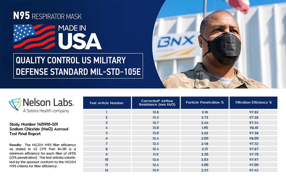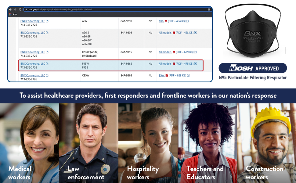 - BNX Quality Promise & Applications – BNX is committed to delivering the highest quality American made safety products using the latest automated manufacturing processes and technology and the strictest quality standards. Our N95 respirator masks are ideal for use by Healthcare and Frontline workers as well in crowded or contaminated areas such as: Commercial Buildings, Construction, Food Processing & Safety, Retail, Manufacturing, Infrastructure, Education, Oil & Gas, Transportation, and more.