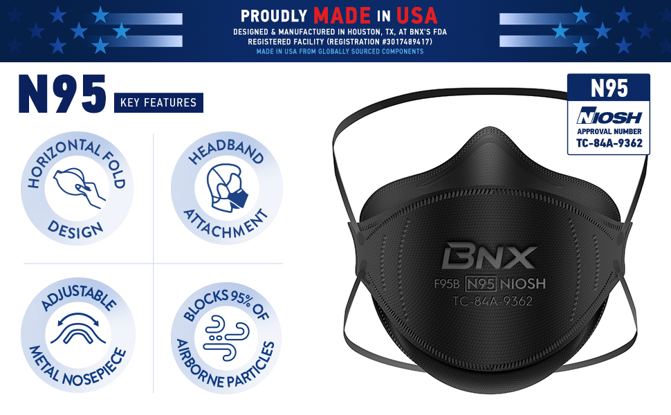 - MADE IN USA* – Manufactured by BNX Converting LLC in Houston TX, a NIOSH/CDC Approved and Registered (Registration # 3017489417) manufacturer of N95 mask respirators. *Manufactured in the USA from globally sourced components.